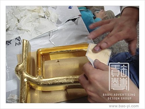 招牌-手工雕刻木頭立體字施作第三階段開始貼金箔-水立方時尚館